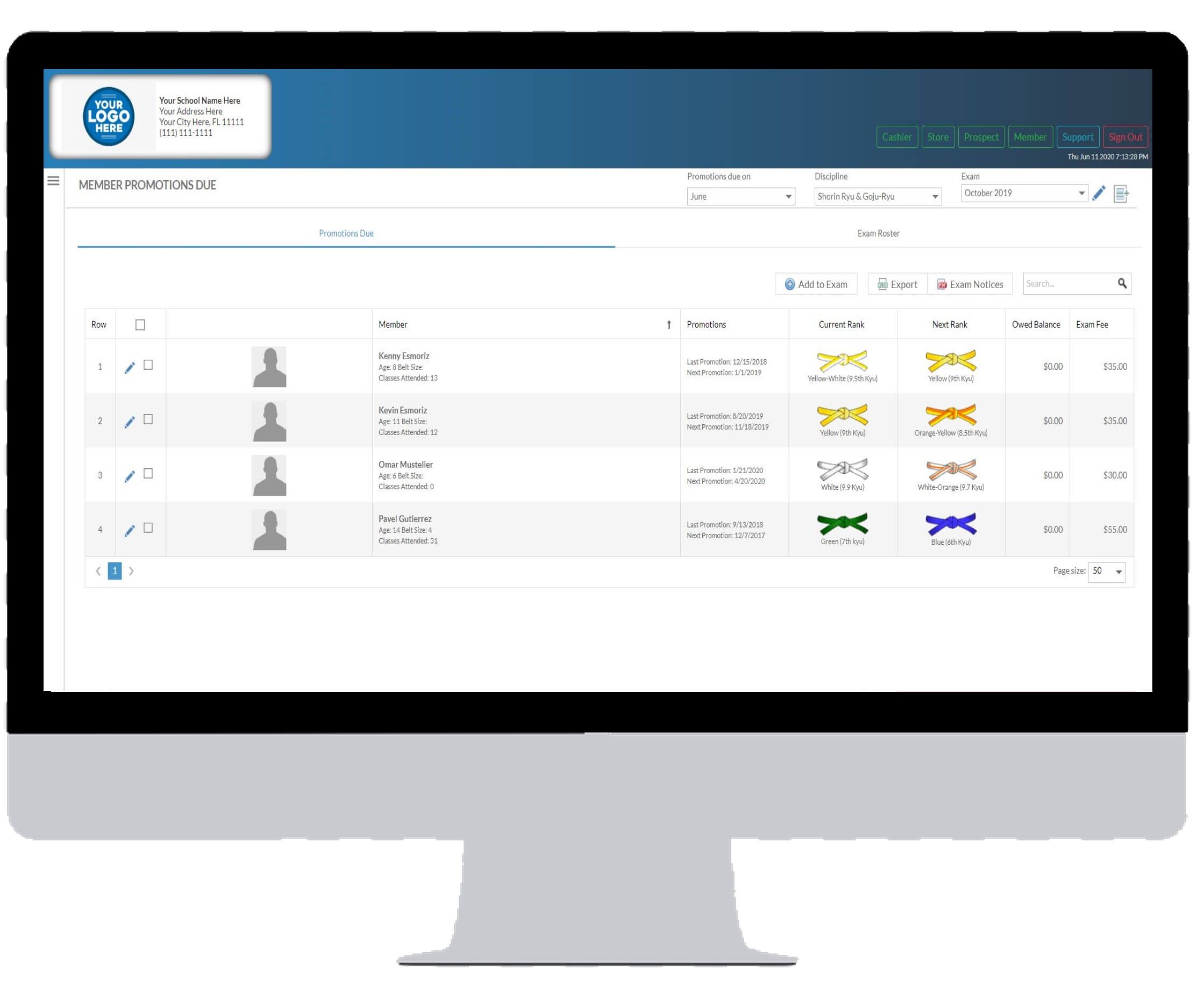 Take your Martial Arts business to the next level. Our simple, configurable Promotions System fits into your Martial Arts program. Automates the belt testing process. With the ability to save martial arts rankings and belt exam results. Tou can access reports to track the belt rank levels of each member. Pre-define your belts, colors, requirements, and exam parameters into the System. Take your business one step further.